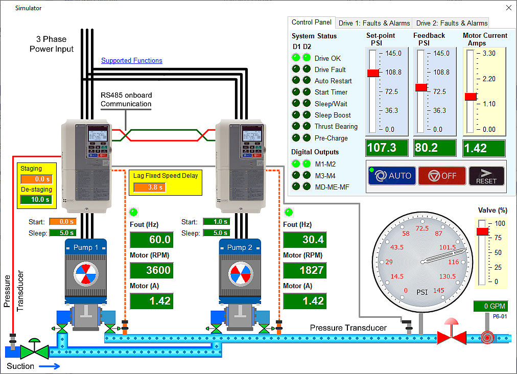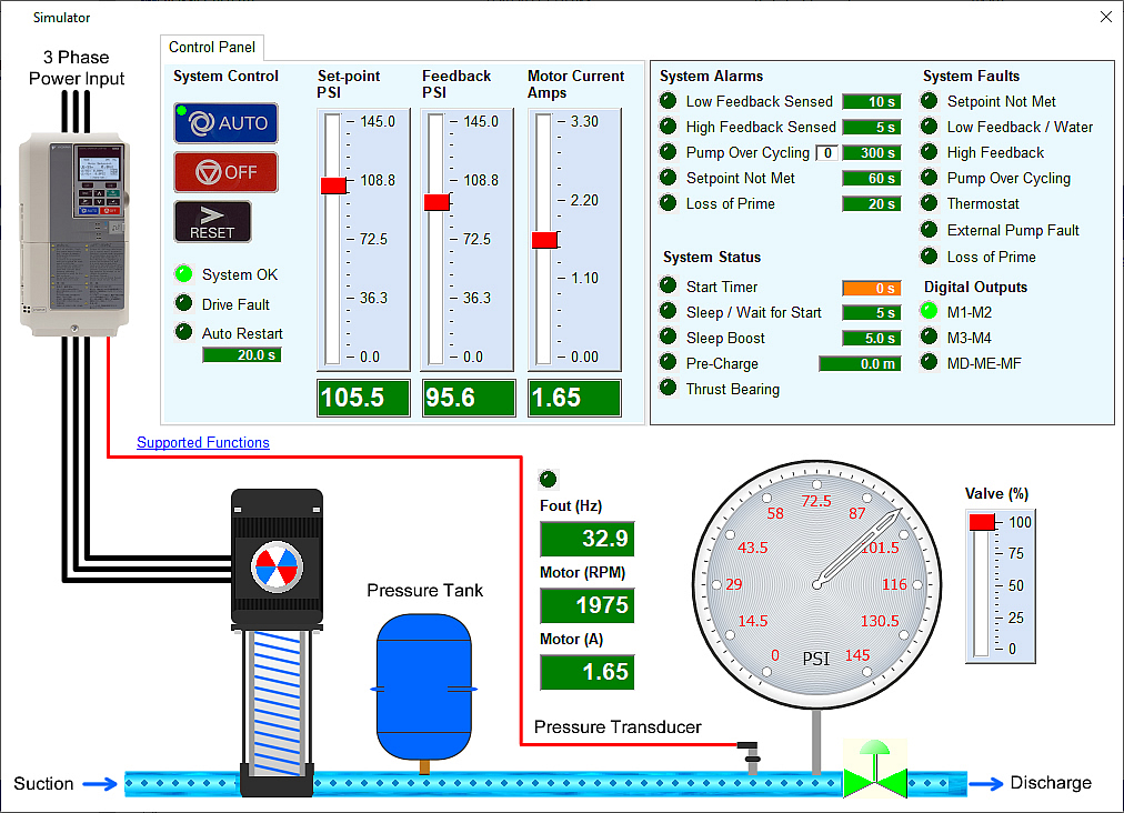 Application simulation software enables users to simulate the actual motor control application without the need for the actual equipment. Our application simulation software can be used as a demonstration tool during a sales meeting or as an interactive tool for training classes.