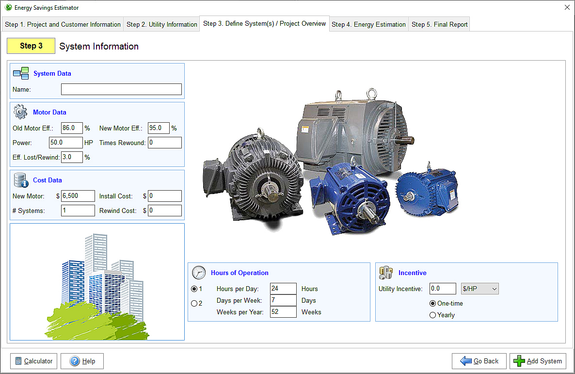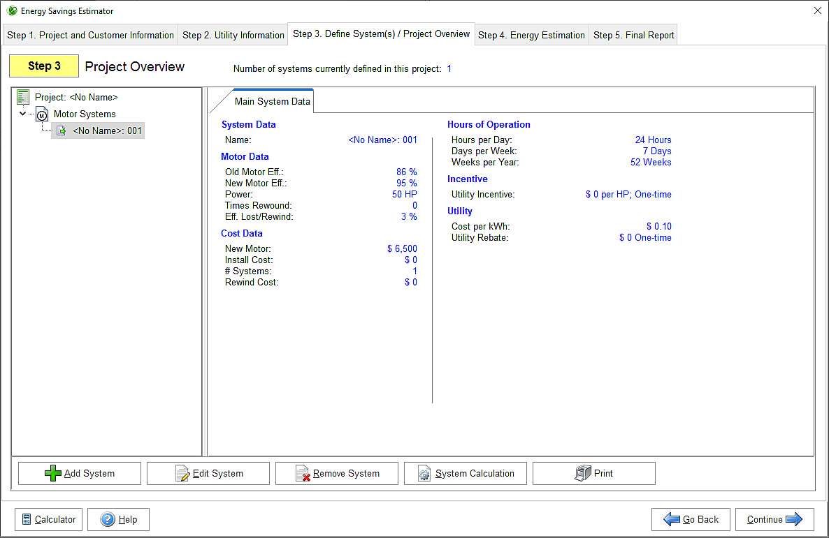 Allows users to estimate energy savings of a project containing multiple motor systems of equal or different size. The software generates multi-page project report including a summary page based on the estimated savings of the total project.