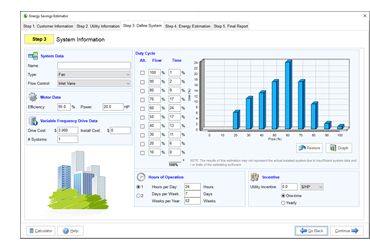 Software estimates energy savings achieved when using a variable frequency drive instead of conventional control methods for fan and pumping applications. The results can be viewed in graphical format and text format and the software has built-in functions to generate an energy estimation report especially designed for consultants.