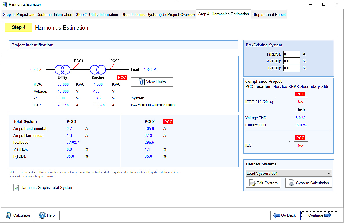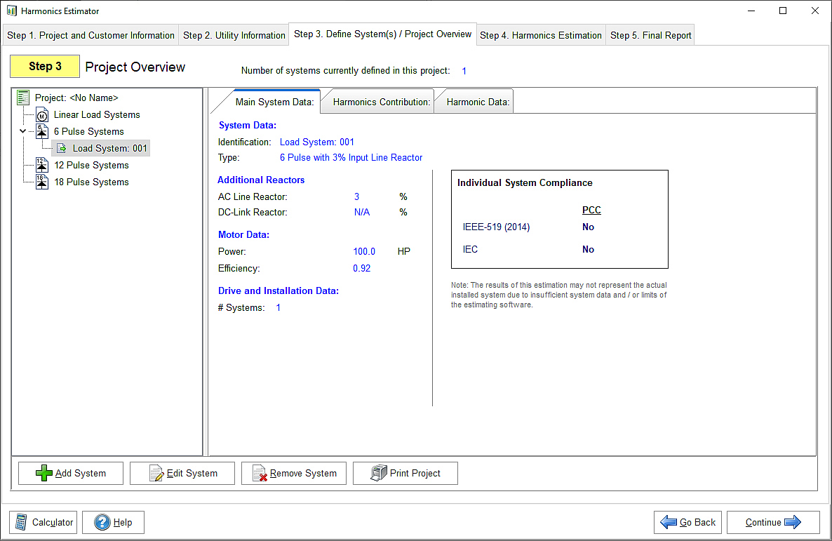 Allows users to estimate harmonic contribution of a single variable system or a project containing multiple systems of equal or different size. The software generates multi-page project report including a summary page based on the estimated harmonic contribution of the total project.